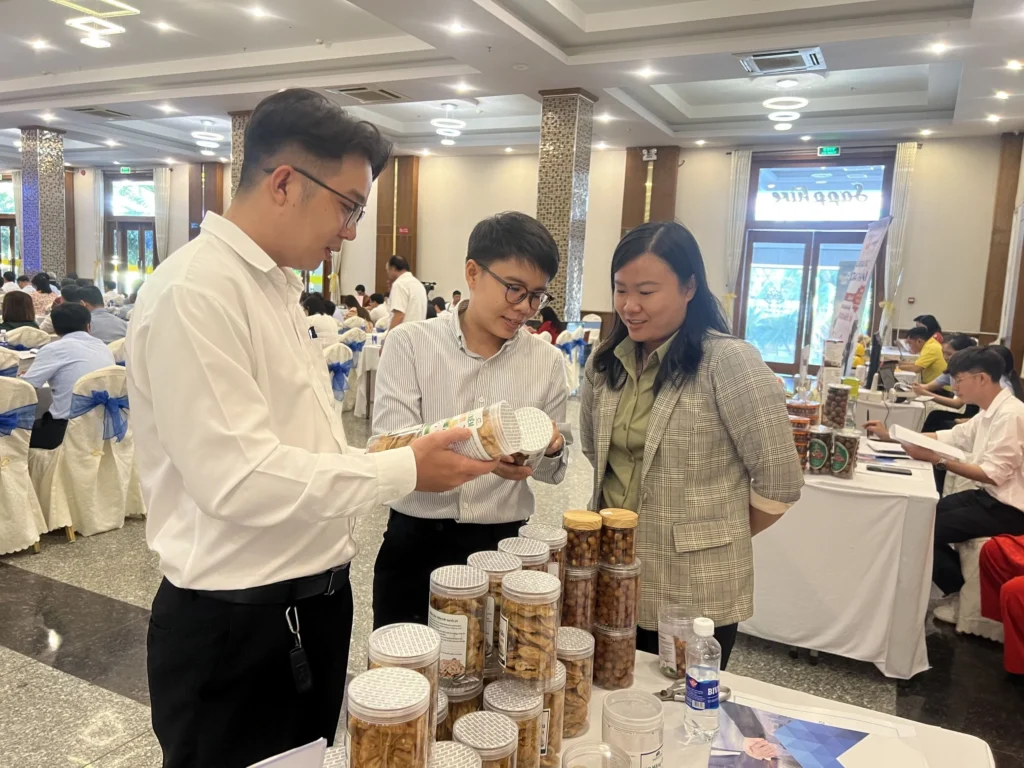 Các đại biểu tham quan, tìm hiểu sản phẩm, hàng hóa của HTX được trưng bày tại hội nghị.
