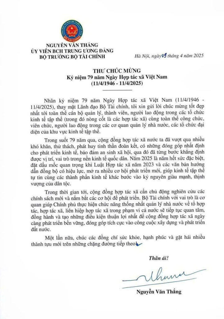 Thư chúc mừng Kỷ niệm 79 năm Ngày Hợp tác xã Việt Nam (11/4/1946 – 11/4/2025) Để lại một bình luận / Khác / Bởi Dương Phục / Tháng 4 11, 2025 Facebook Linkedin Twitter Pinterest